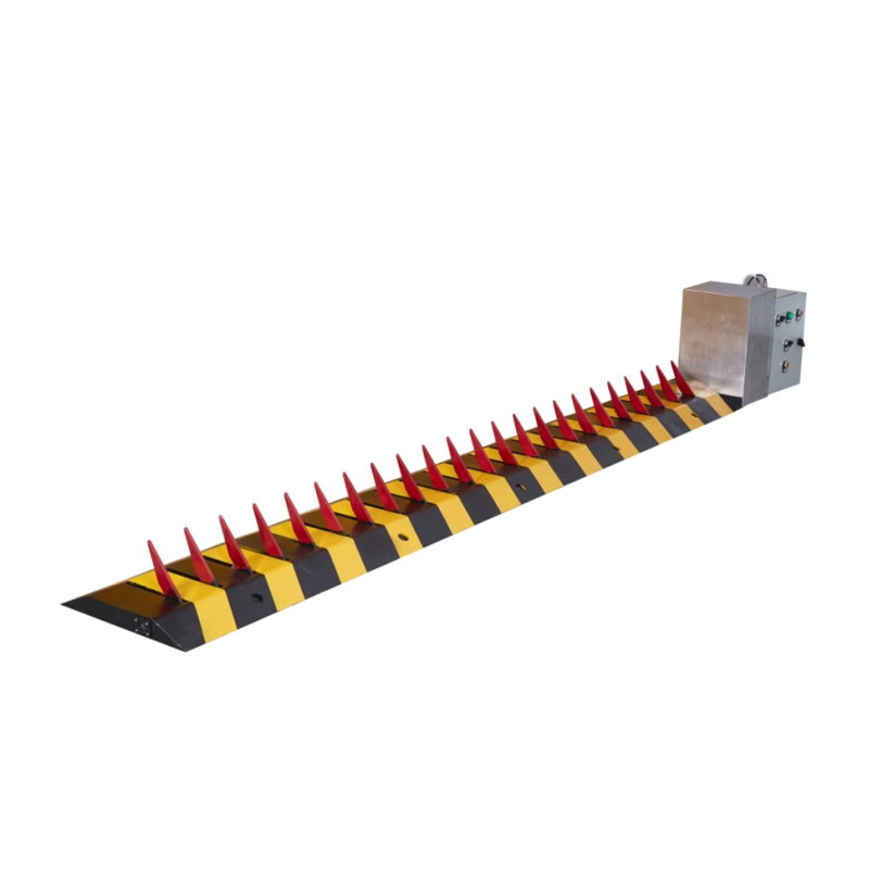 阻車器主要由翻轉體、機座組成(防撞齒釘可根據客戶需要調整高度)。整機為鋼結構,采用國標A3鋼板焊接而成,具有高強的承重和抗撞能力;機體內無電器、無線路設置,防水、安全。該裝置埋設在車道上或大門的指定位置,通過值班人員的指令限制車輛通行。